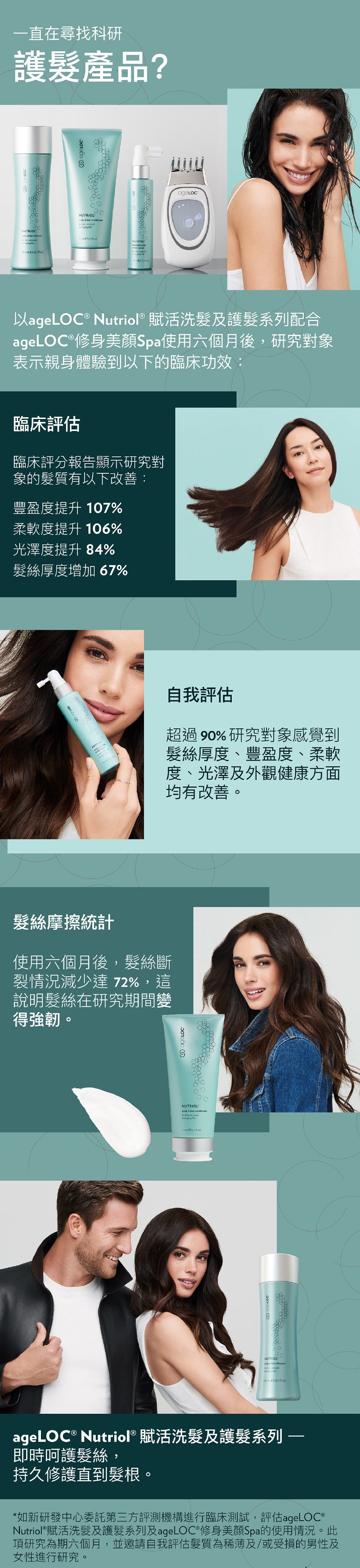 那麼,頭髮毛躁應該怎麼辦?建議由日常洗頭開始,透過正確洗髮程序、選擇合適洗頭水及定期深層護理,能有效改善頭髮毛躁。平日保養可選用富含高保濕成分的洗頭水,推薦使用 Nu Skin ageLOC® Nutriol® 賦活洗髮露—— 產品結合 Nu Skin 專利 ageLOC® 抗老科技與多重賦活配方,包括紅三葉草、甘草根萃取物、肽複合物及蛋白親和成分,從髮根到髮尾提供深層滋養。此配方特別針對頭皮易出油、髮根扁塌、經常染燙或缺乏光澤的髮質設計,持續使用數星期即可提升髮絲豐盈度及強韌度,重現健康亮澤。