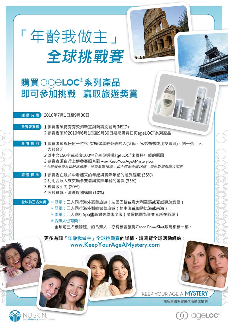 參賽資格: 參賽者須持有有效如新直銷商識別號碼(NSID),並於2010年6月1日至9月30日期間購買任 何ageLOC系列產品
