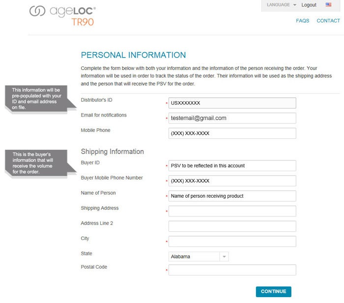 If you have selected to purchase the product for yourself, you will not see this page. You will be directed to the product selection page. If you are placing the order for someone else your information will still be listed in the top section so that you can track and update the order. The buyer ID and fields under Shipping Information is where the volume will be placed and where the product will be shipped to.